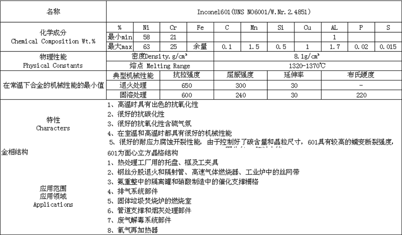 Inconel601不銹鋼無縫毛細(xì)管在高溫時具有出色的抗氧化性和很好的抗碳化性,而且有很好的抗氧化性能含硫氣氛,在室內(nèi)和高溫時都具有很好的機械性能,由于控制了碳含量和晶粒尺寸,也具有很好的耐應(yīng)力腐蝕開裂性能,Inconel601不銹鋼管具有較高的蠕變斷裂強度,因此在500℃以上的領(lǐng)域推薦使用。Inconel601不銹鋼無縫毛細(xì)管廣泛應(yīng)用于排氣系統(tǒng)部件,管道支撐和煙灰處理部件,廢氣解毒系統(tǒng)部件和氧氣再加熱器等領(lǐng)域。